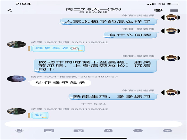 各显神勇,开展别样教、别样学。授课教师各展所长,选用QQ、微信、学习通、超星、慕课和直播平台等软件进行线上教学。在线上授课前,威廉希尔体育教师为学生制作了相关的教学视频,帮助学生在授课前线下“自学、自练”;在授课过程中不仅是学生上课,有的学生家长和学生所在社区也被吸引前来“蹭课”;每位教师讲授的“体育健康”知识,深受学生及学生家长赞誉;同时任课教师在线上进行“辅导”,线上线下“学练辅”三结合,真正做到了用运动“祛”走病毒、用太极“练”出免疫力。