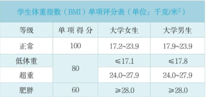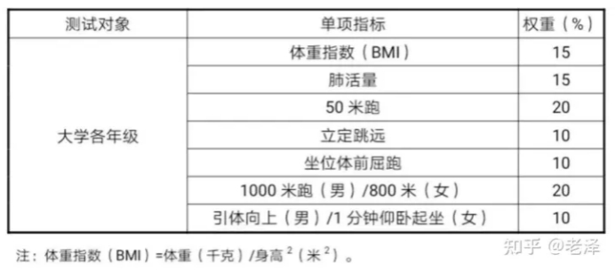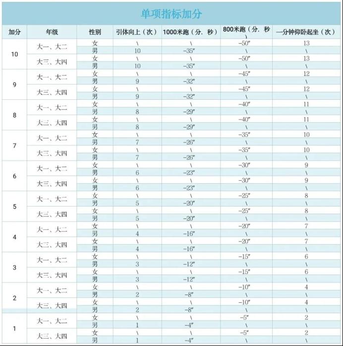 标准分由各单项指标得分与权重乘积之和组成,满分为100分。附加分根据实测成绩确定,即对成绩超过100分的加分指标进行加分,满分为20分;大学的加分指标为男生引体向上和1000米跑,女生1分钟仰卧起坐和800米跑,各指标加分幅度均为10分。