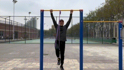 动作要领:根据自身肌力水平选择一根适当阻力的弹力带。起始时使用阻力较强的弹力带,随着训练的进展,可以逐渐减小弹力带阻力。将弹力带的一端固定在单杠上,另一端环住脚掌或膝盖,以提供向上的助力。悬挂在单杠上,手臂伸直,借助弹力带的助力,使身体保持稳定。用背部和手臂的力量将身体向上拉,直到下巴越过单杠。而后缓慢地控制身体下降,回到起始的悬挂位置。