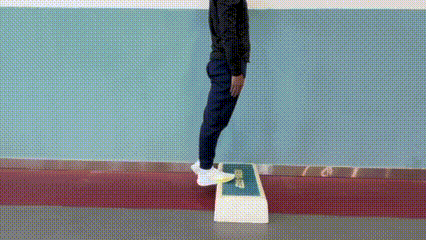 动作要领:站在一个台阶或垫高的平面边缘,脚的前部放于台阶上,脚跟悬空,单脚站立。缓慢地降低脚跟,直到感觉小腿肌肉得到充分的拉伸。当脚跟低于台阶平面后,用脚尖推动身体上升,将脚跟提升至可能的最高位置,控制脚跟再次缓慢下降,重复此动作。
