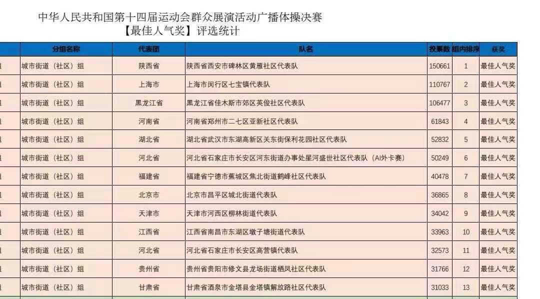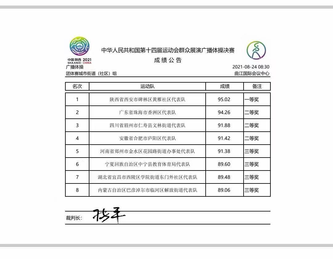 8月22日,第十四届全运会群众赛事活动展演项目启动仪式在西安曲江国际会议中心举行。据悉,第十四届全运会群众赛事活动展演项目分为广场舞、广播体操、健身气功、太极拳4个大项,采取上传视频线上参赛,通过决赛进行线下评审最终选出各类奖项。广播体操设个人赛、三人赛、团体赛三个分项,线下参赛队伍242支、运动员1318名。中华人民共和国第十四届全运会广播体操比赛落下帷幕。陕西省在疫情防控的严峻形势下,组织严密,热情周到,迎接来自全国各地的运动员、教练员、裁判员,经过七天八场的严格评审。我校威廉希尔体育教师闫勇江所在团队获得全国人气第一名,总成绩一等奖。
